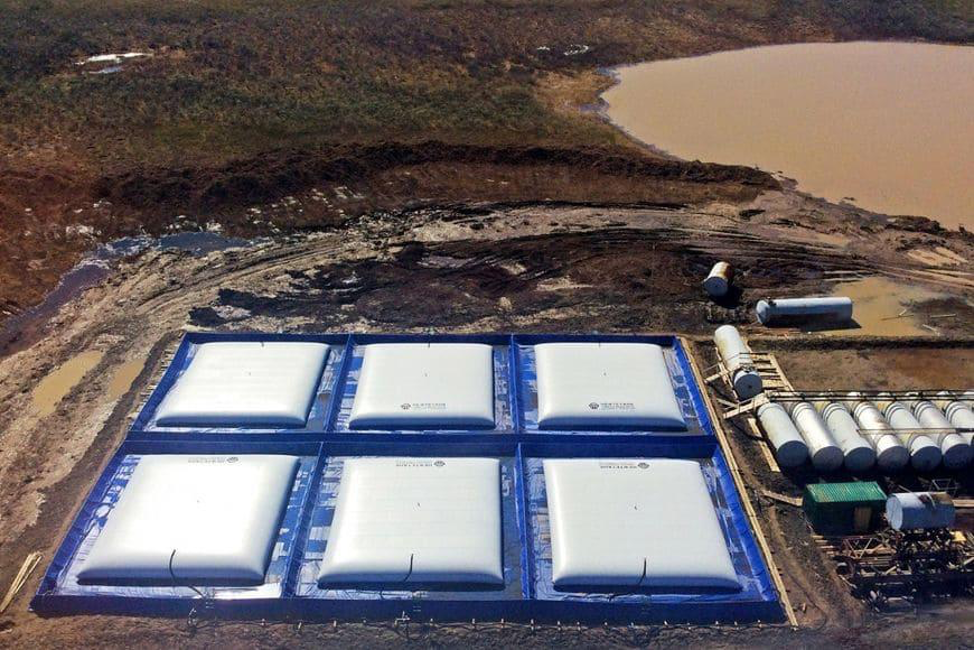 Размещение полимерных эластичных резервуаров предусматривается в пределах обвалования с гидроизоляционным полимерным покрытием дна и откосов, предназначенным для предотвращения фильтрации и локализации проливов хранимого продукта.